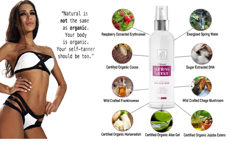 I feel pretty indifferent on the subject. The tan effect you get from spray tans is from DHA reacting with amino acids in your skin - DHA is present in all tanning spray regardless of the organic label otherwise it would not work. There is some research suggesting that DHA can have negative effects on DNA which I think is pretty scary for a developing baby.