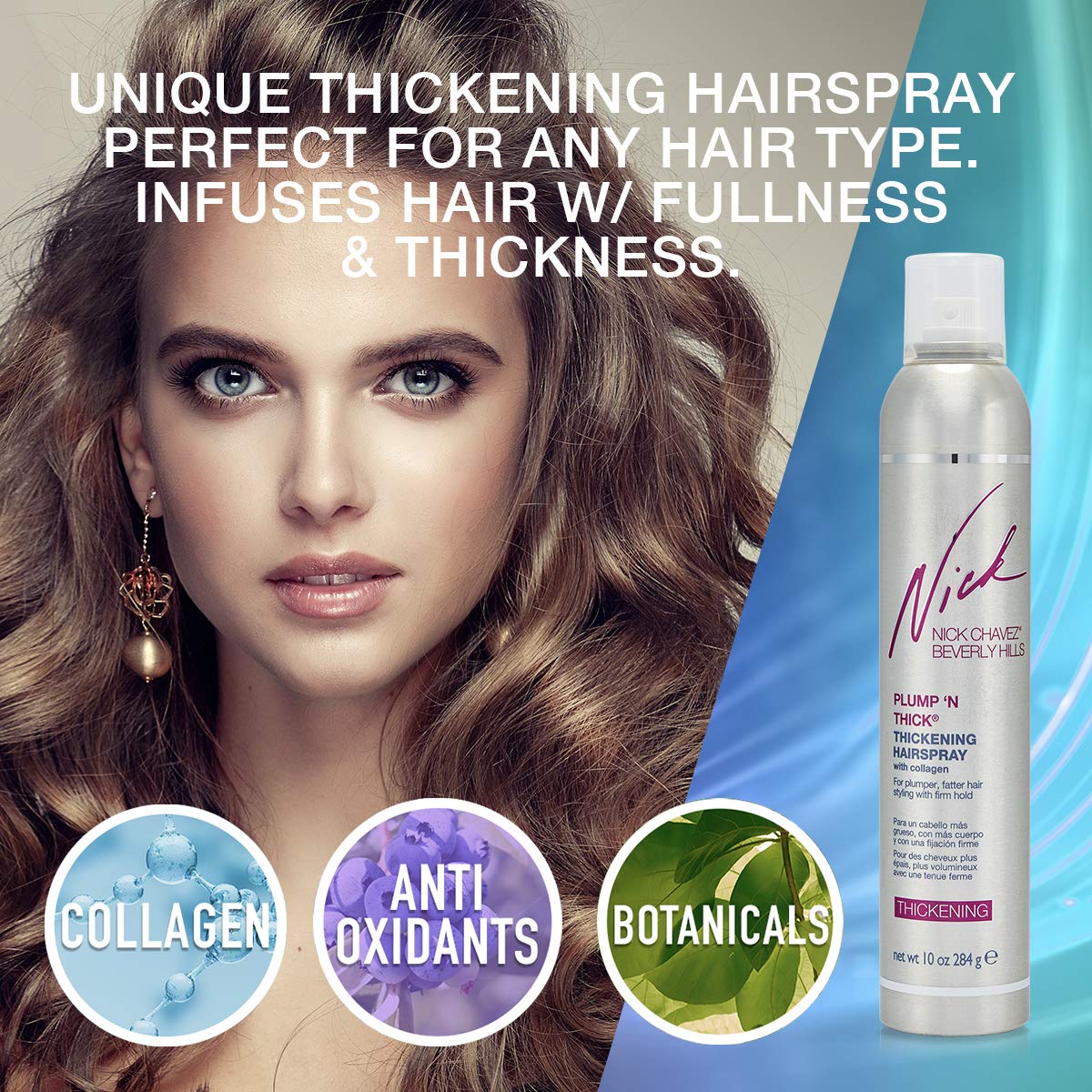 Infuses hair with fullness and thickness. Nick Chavez Beverly Hills Advanced Plump N Thick Thickening Hairspray - Hair Thickener For All Hair Types - Increase Hair Volume And Strengthen Hair - 10 Oz. Helping all women achieve that Every Day Gorgeous look through healthy shiny beautiful hair.