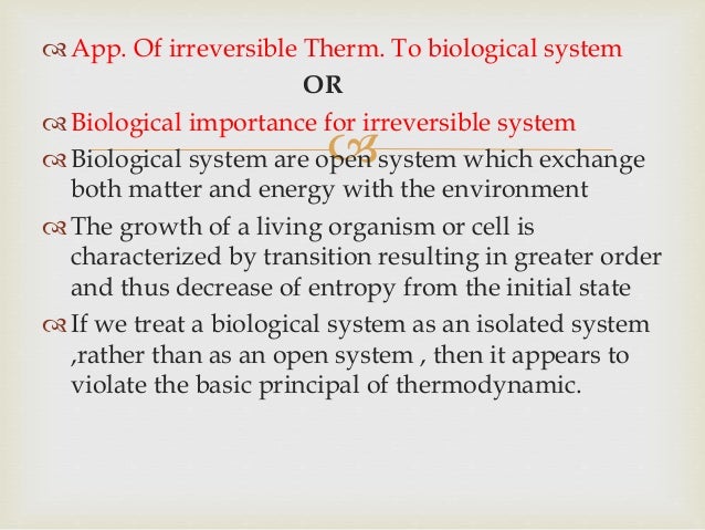 Application of Thermodynamics evolved before the subject itself. The Principle of Conservation of Energy. PowToon is a free. This chapter discusses about coupling of Gibbs energies in biological systems to understand protein and nucleic acid structures in terms of thermodynamics and to understand the interactions in the DNA molecule to assess the stability of DNA. These principles govern the chemical processes metabolism in all biological organisms. Biological sciences could be greatly impacted by a thermodynamics theory which emphasizes less cosmological but more practical reasoning applied to food bioresources water quality and biotechnology problems. Biological Systems Engineering is illustrated in Figure 1 which gives a pictorial overview of this discipline. The best example is the generation of ATP. One way to assess the stability of DNA is to determine its thermal stability.