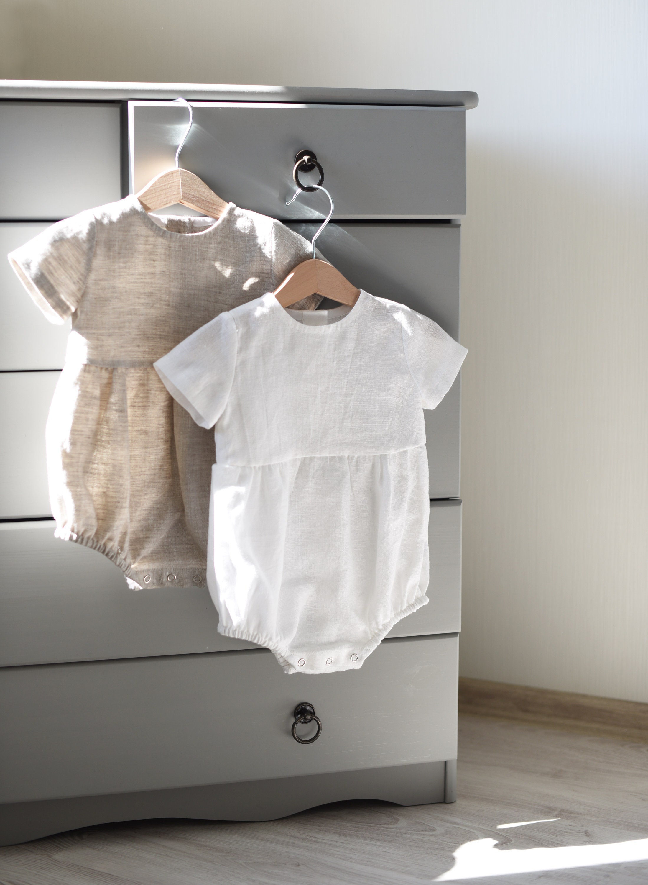 5 out of 5 stars. Baby Boy Romper - Baby Boy Linen Romper - Baby Gift - Baby Girl Linen Romper LittleDashingDarling. It features decorative straps and buttons on the front.