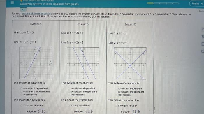 Classify the system of equations and identify the number of solutions. System A System B System C 1 Line 1. Systems of Equations Calculator is a calculator that solves systems of equations step-by-step. For example y x x y. Will give out brainliest. This video looks at classifying systems of equations consistent inconsistent independent dependent and determining the number of solutions without graph. If the system has exactly one solution give its solution. Given a situation that represents a system of linear equations write the system of equations and identify the solution. Maxwells equations for electromagnetics D ρ B 0 E B t H J D t.
